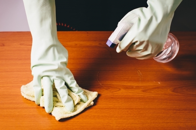 テーブルや椅子などの消毒清掃を実施